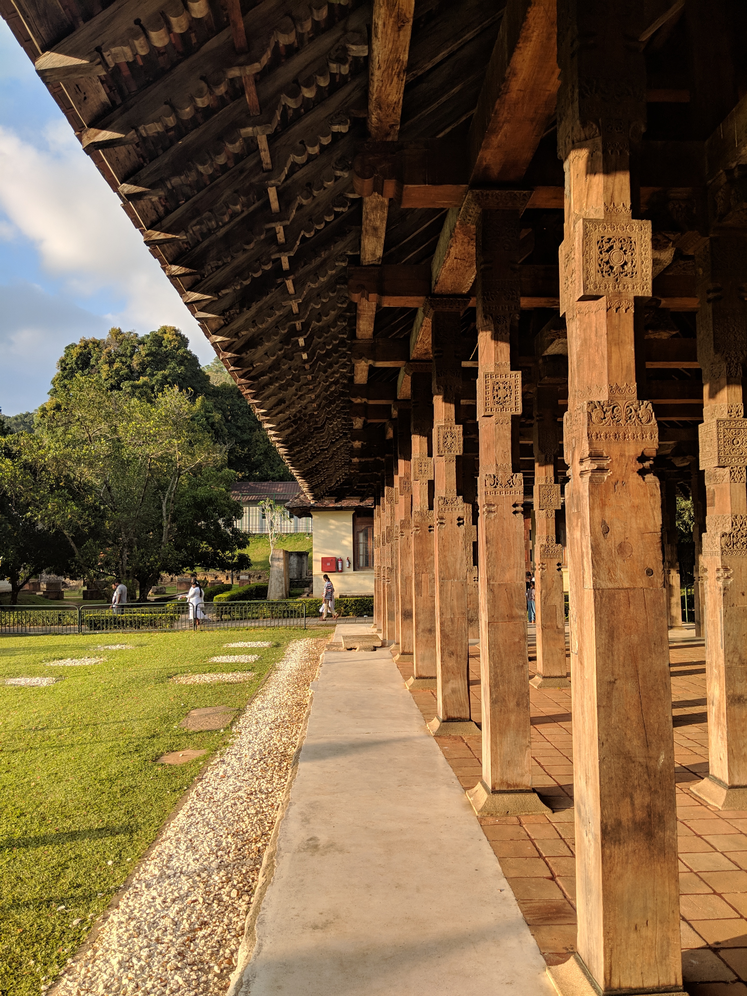After finishing up at the gardens we got the bus back into Kandy and decided to visit the Temple of the Sacred Tooth. When we first approached the entrance we were turned away as Richie was wearing shorts (I had covered up with a sarong), so after a quick pit stop back at our hotel for a swim and a change we went back. You enter the grounds for free so you can walk around the outside in the gardens, to go in the temple itself you need to buy a foreigners ticket from the ticket office which is round the side next to the lake, for 1000rps each (£4.20). You then need to walk back around the front to the other end to check in your shoes before heading in. Around the shoe check-in were a lot of people trying to sell you their services as a private tour guide, quite persistently. We declined as we had a guide book and also were just wanting to wander round in our own way, it took a while for them to get the hint but eventually they left us alone. You were also offered lotus flowers to leave at the shrine as a token, again these were for a fee. I declined, not because of having to pay for them, but because I am not religious in any way it felt a bit false. We headed inside and used our Rough Guides book for a personal tour which worked really well, telling us enough about each of the spaces we were in and allowing us to move through the building at our own pace. We spent around an hour overall in the temple which was nice, especially as the sun was getting low so everything was lit with a warm yellow glow.