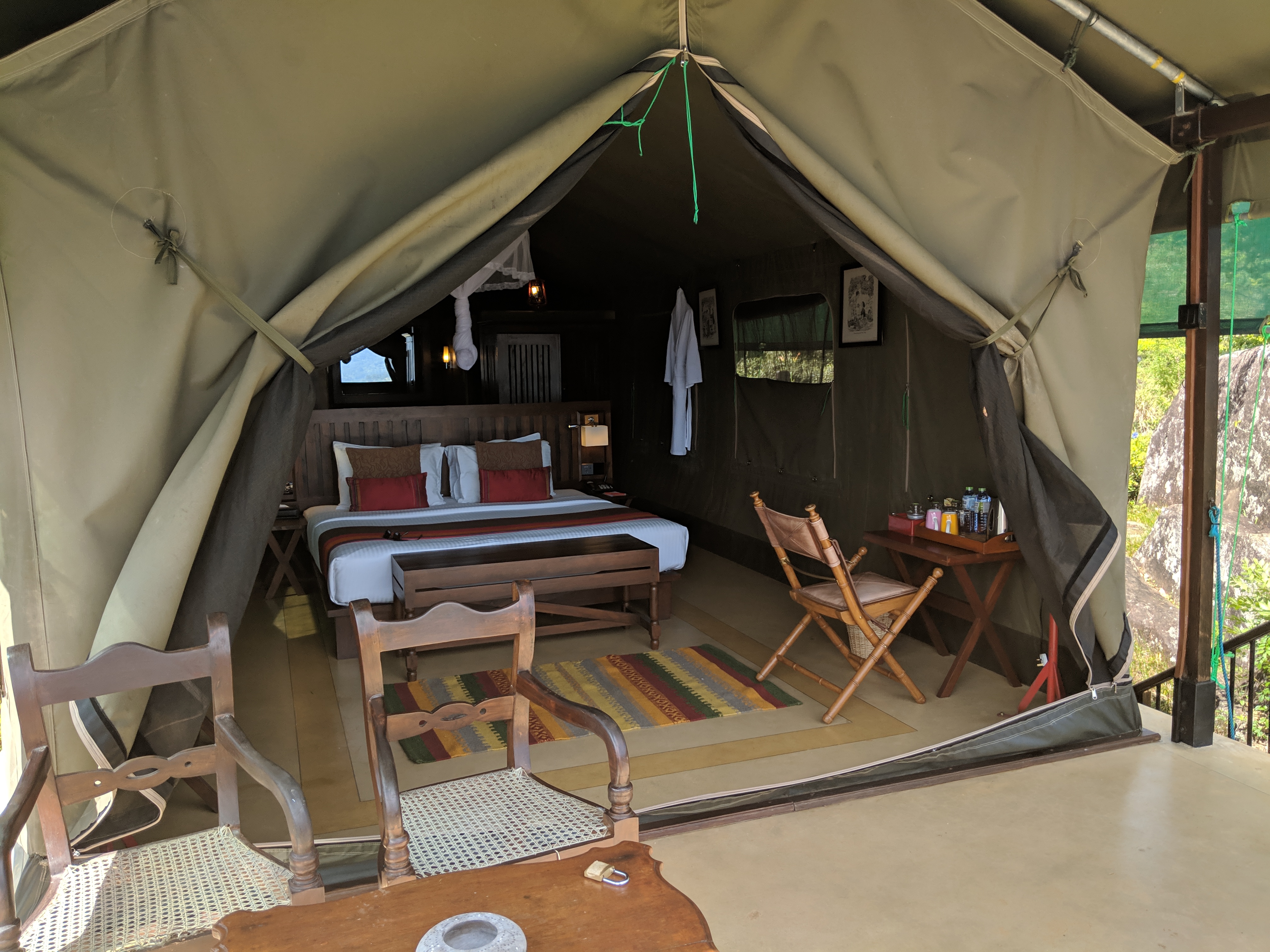 Even though we were really quite early the staff were so accommodating and checked us in straight away while we sat trying to take in the view with a cup of tea and biscuits. We were then shown to our lodge, which are set within the tea plantation on the hillside below. Each lodge is accessed via its own private path and has a private terrace. The lodge itself oozes luxury, with beautiful furniture set within a large tent overlooking the Knuckle mountains. Its the little extra details which I love, such as a choice of loose leaf tea, and the hurricane lamps in each corner.