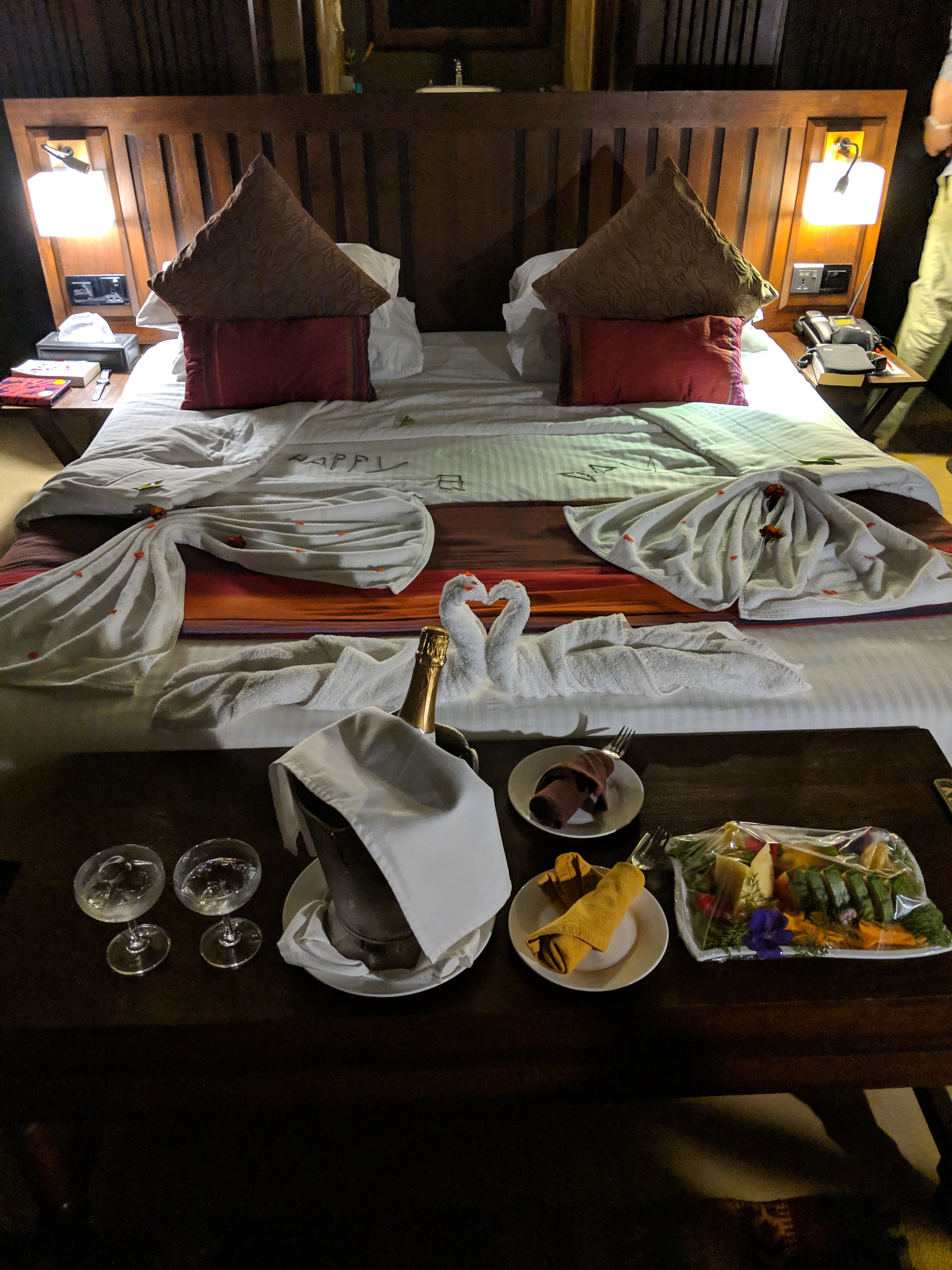 Dinner varied every night, with both Sri Lankan and western options available. I had emailed in advance mentioning Richie’s birthday, but had sort of forgotten about our conversations. But the staff had remembered and were so lovely, bringing out a cake on our first night just for him, plus setting up champagne in our lodge with a plate of fresh fruit.