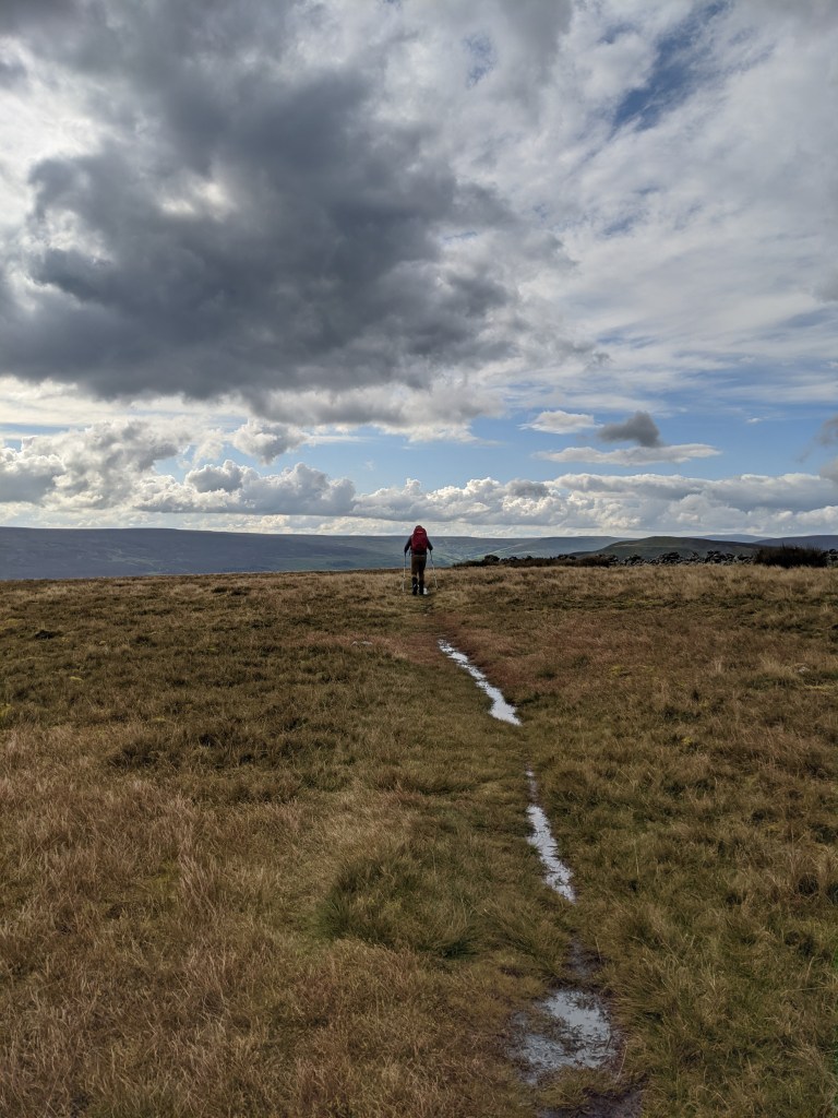 The walk continued up through Marrick and on towards Fremington Edge on a small road. We turned off the lane and onto the path which stretches long the top of the ridge, climbing steadily for a few miles. The path runs parallel to a wall which separates the front of the ridge from the moor behind, which means there are a few boggy bits to work around.