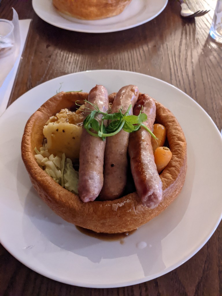 Needless to say when we got back we were pretty hungry, having only had some cereal bars to keep us going on the 12 mile walk, so we headed to the Black Bull hotel on the green to tuck into a hearty Yorkshire meal. This was basically a huge Yorkshire pudding filled with mash, gravy and delicious sausages.