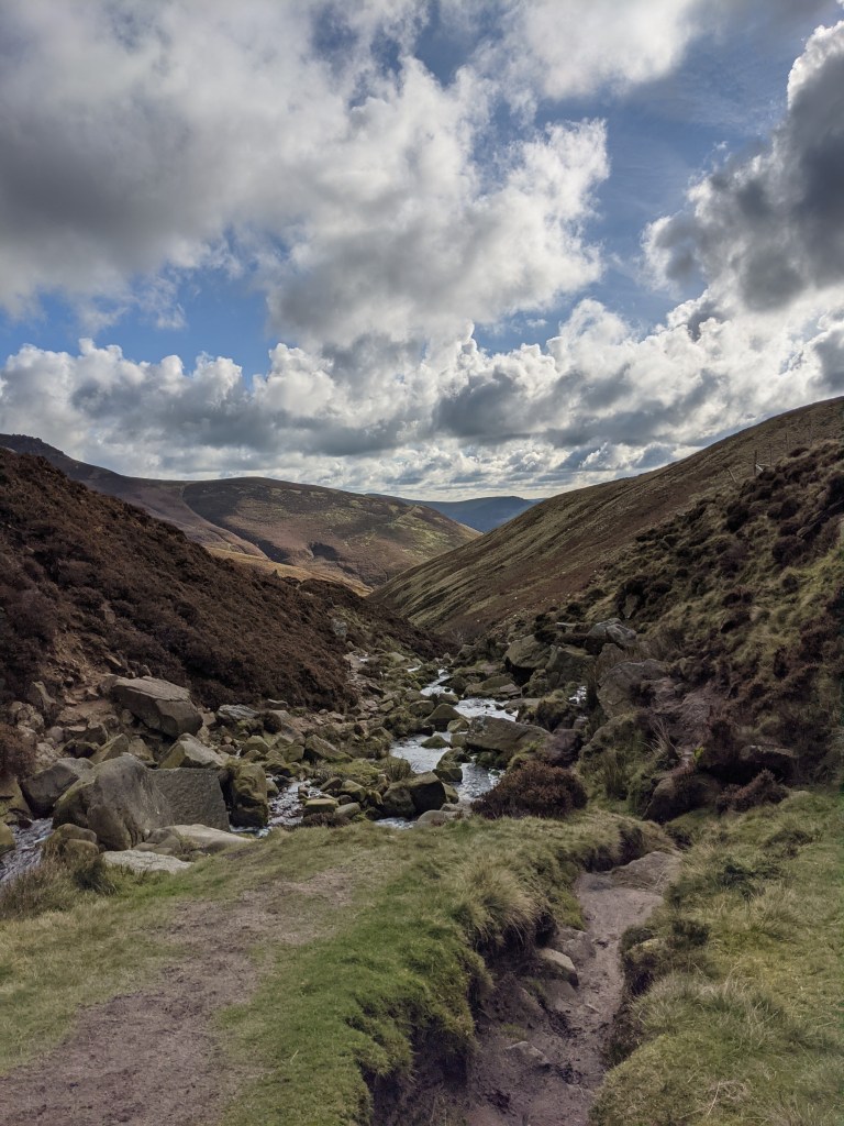 The path climbs slowly up the valley (or clough as they are know locally), and after around a mile the path starts to turn progressively steeper and rockier. At some points it feels as though you are scrambling up through the river bed, over and around large boulders, before reaching the head of the valley with a very steep climb up to the plateau. This bit is hard going but short, and the views at the top are worth the hardwork.