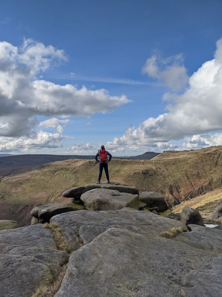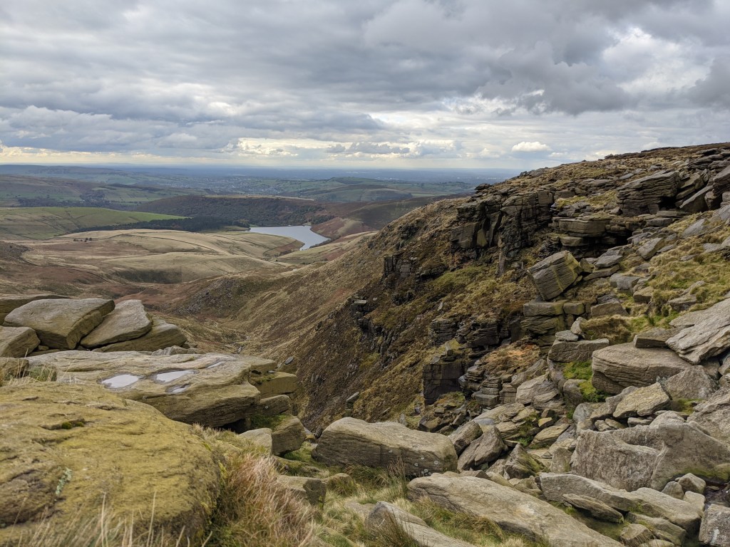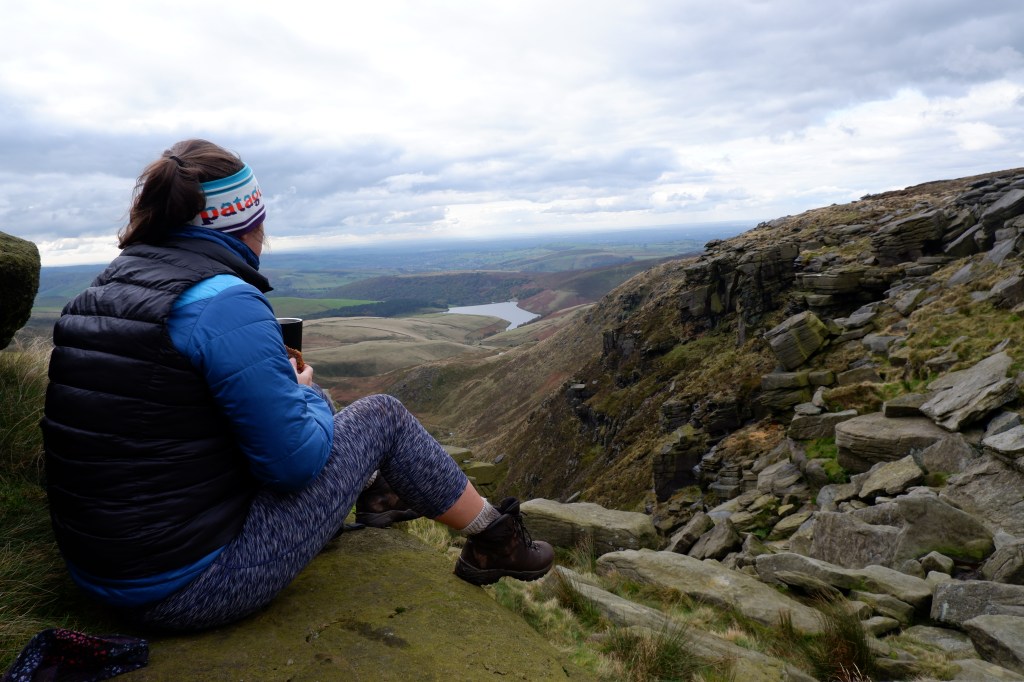 Eventually, after what felt like miles, we found the head of the River Kinder which we knew led to Kinder Downfall and so we followed its banks to find our way out again. We passed through Kinder Gates which are impressive rock formations before reaching Kinder Downfall at the edge of the plateau. Here there are impressive views out across Kinder Reservoir and beyond – and was a perfect pit stop for tea and flapjack.