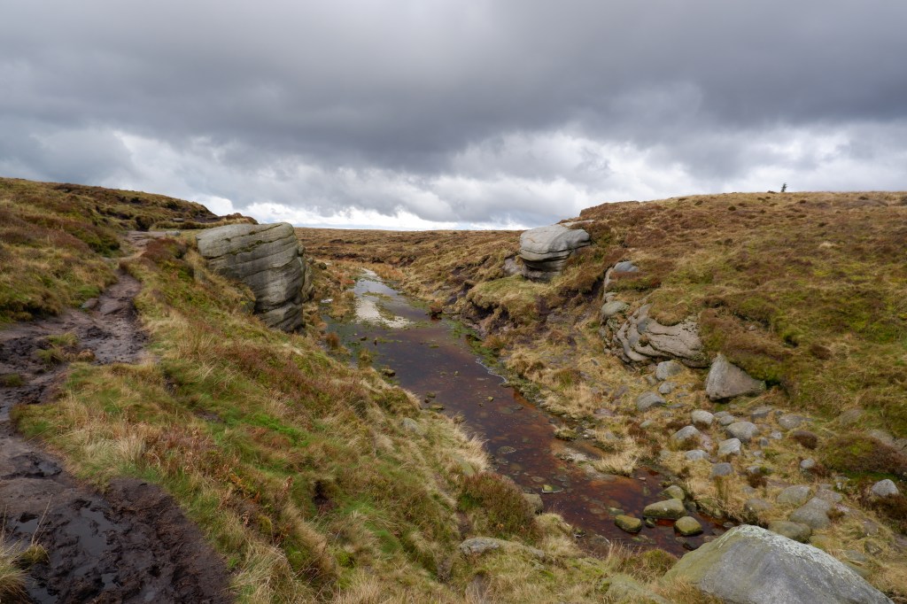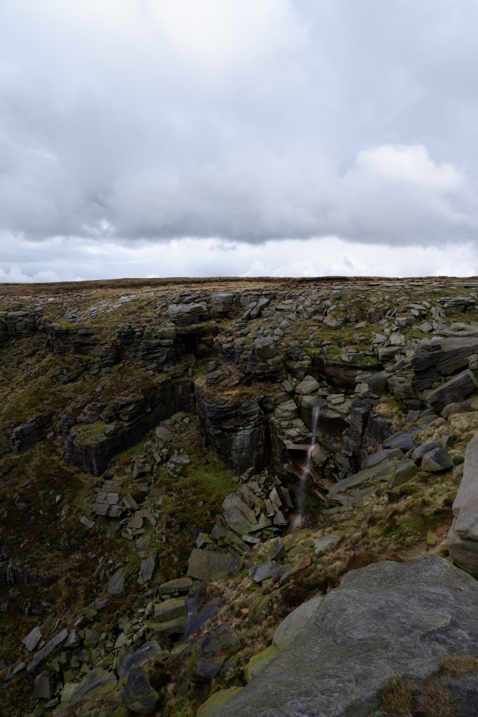 You can continue around the edge of the plateau to reach Kinder Downfall, but the route we were following suggested cutting across the middle of the plateau which we thought was a good idea. In hindsight I would not recommend doing this and stick to the outside as it is a bleak trek across the peat otherwise. The route described this as an undulating peat desert, which I’m sure in summer may be the case, however in October after heavy rain this is more like a large peat swamp. The path quickly disappeared and so we were left trying to traverse peat trenches which were often 2m+ deep and wide with deep peat bogs at the bottom. We kept hoping we had just wondered off the path so spent quite some time trying to find it before realising there wasn’t one so we just trudge onwards, often sinking up to our knees with a misplaced step.