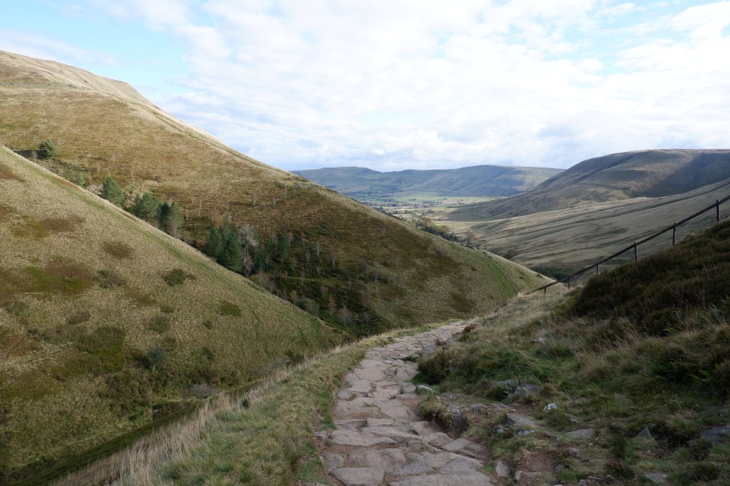 At Kinder Downfall the path intercepts the Pennine Way. After feeling a bit more refreshed we headed back along the edge of the plateau towards the Kinder Low Trig Point (about 3km from the Downfall), and then chose the path which lead down towards Edale. Once on the descent I was pleased we decided to do the walk that way round as it would have been a much longer steep ascent otherwise. The path descends by Jacob’s Ladder, a steel zigzagged series of steps parallel to the River Noe, and then onto farm tracks.
